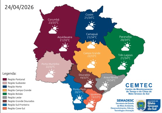 A previsão do tempo para esta sexta-feira (24) indica predomínio de sol e variação de nebulosidade em MS (Mato Grosso do Sul) . O tempo firme ocorre devido à atuação de um sistema de alta pressão atmosférica, que favorece condições mais quentes e secas em todo o Estado.