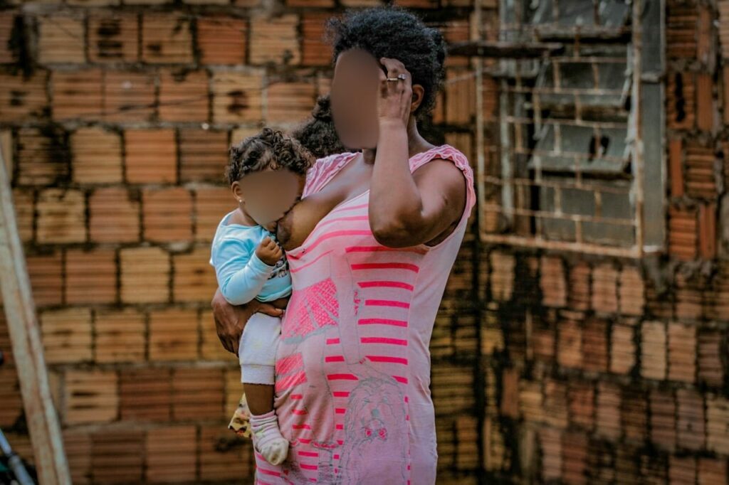 Mulher negra com a filha nos braços. O cotidiano das periferias revela como raça, maternidade e vulnerabilidade territorial ampliam o impacto da violência e a distância da rede de atendimento. Foto: Marcus Maluf