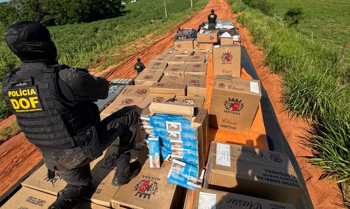 Caminhões e uma picape foram abandonados após motoristas fugirem por uma plantação de mandioca em Mundo Novo; ninguém foi preso Dois caminhões carregados com 27.500 pacotes de cigarros contrabandeados do Paraguai e 10 toneladas de agrotóxicos foram apreendidos na manhã desta terça-feira (18) na MS-386, em Mundo Novo. A ação ocorreu na região conhecida como Estrada do Lixão, onde um bloqueio policial estava montado. Um terceiro veículo, uma Fiat Strada, também foi recolhido com 15 fardos de cigarros eletrônicos. Ao